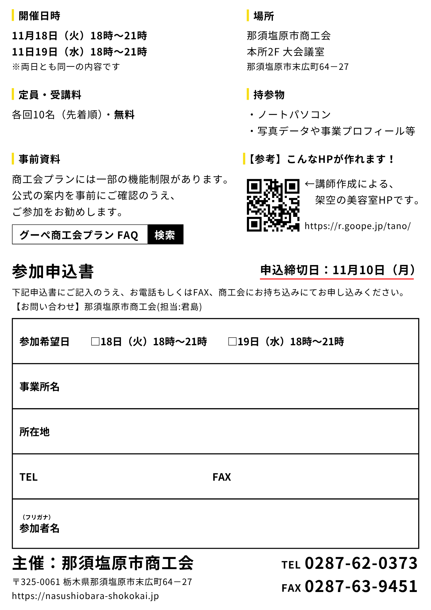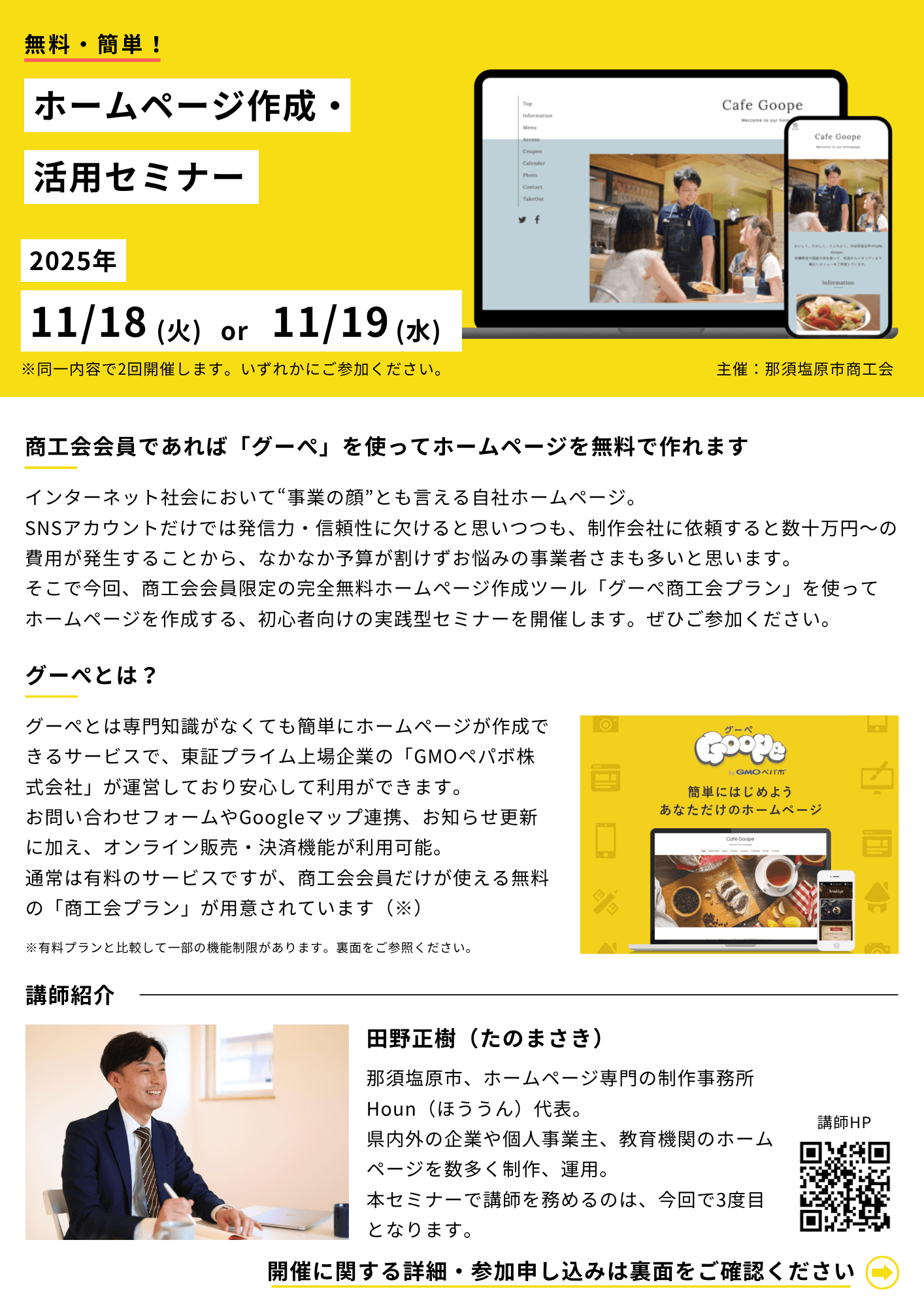 那須塩原市商工会さま主催にて、ホームページ作成サービス「グーぺ」の活用セミナーを開催、講師を務めます。今回で3度目となります。