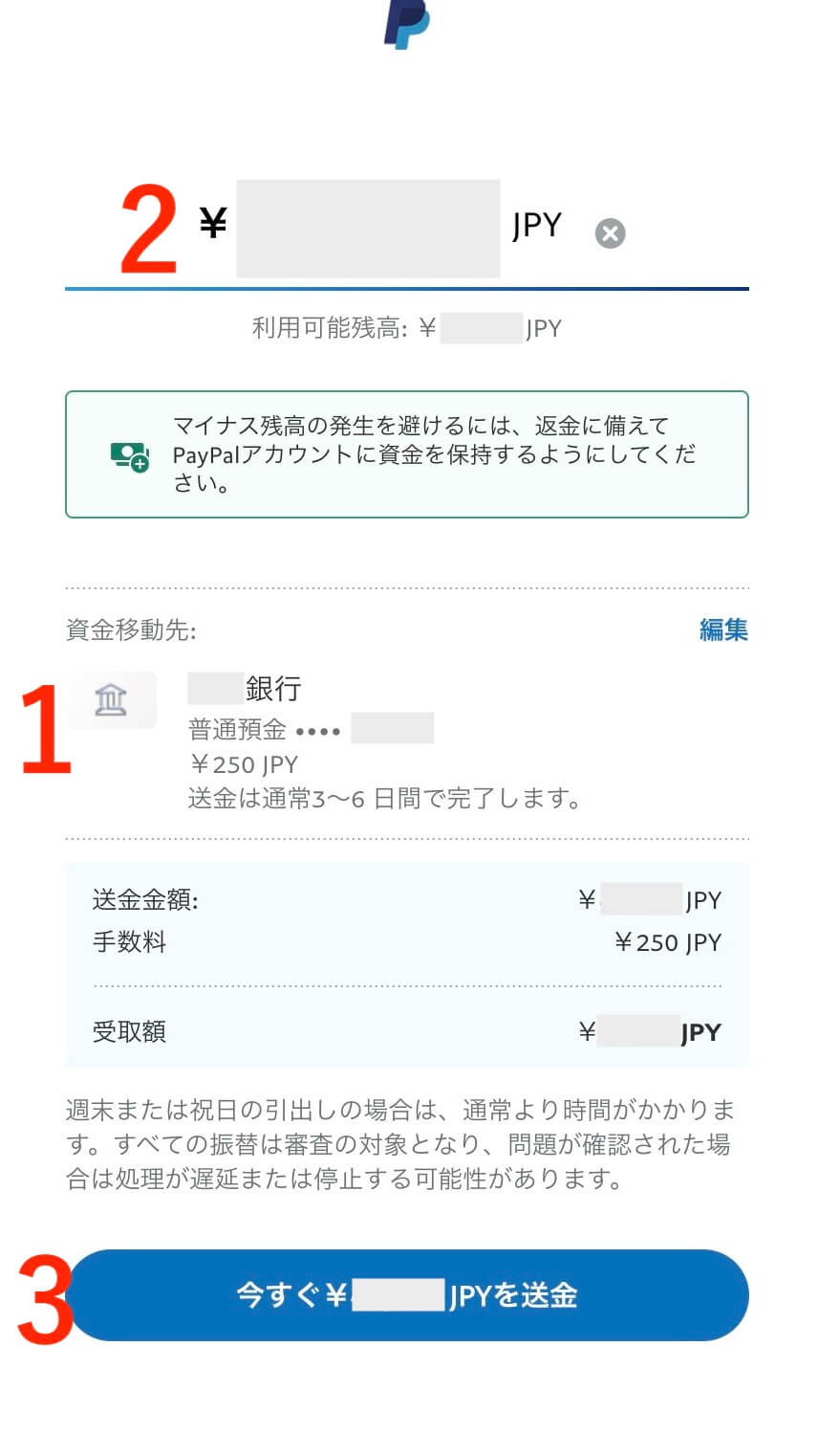 - PayPalは、初期状態では手動で振込申請して3〜6営業日で入金。