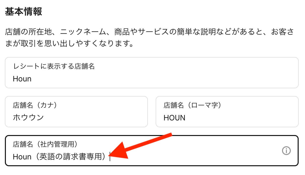 「店舗名(社内管理用)」という欄があるので、ここに「英語の請求書専用」など、用途が分かるように記載しておくと管理しやすいです。