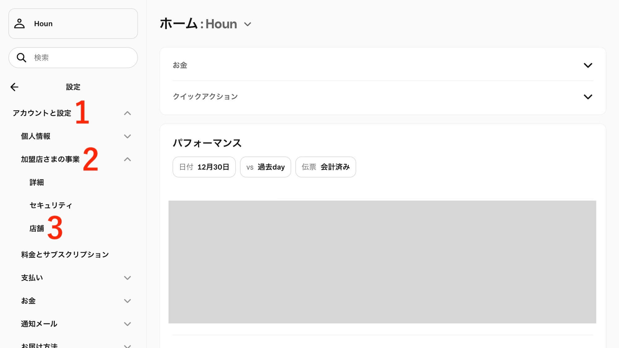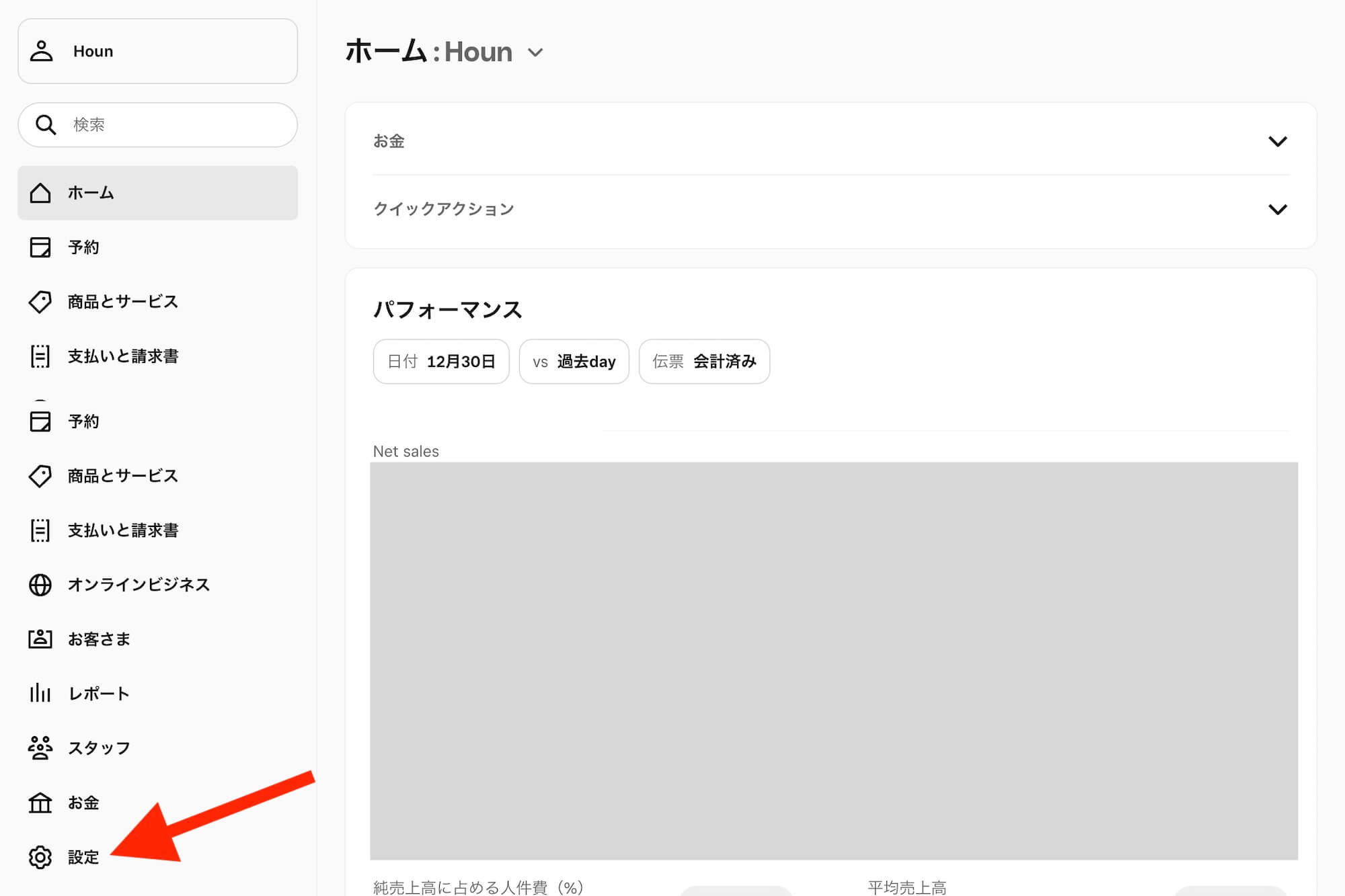 Squareデータから「設定」をクリック。