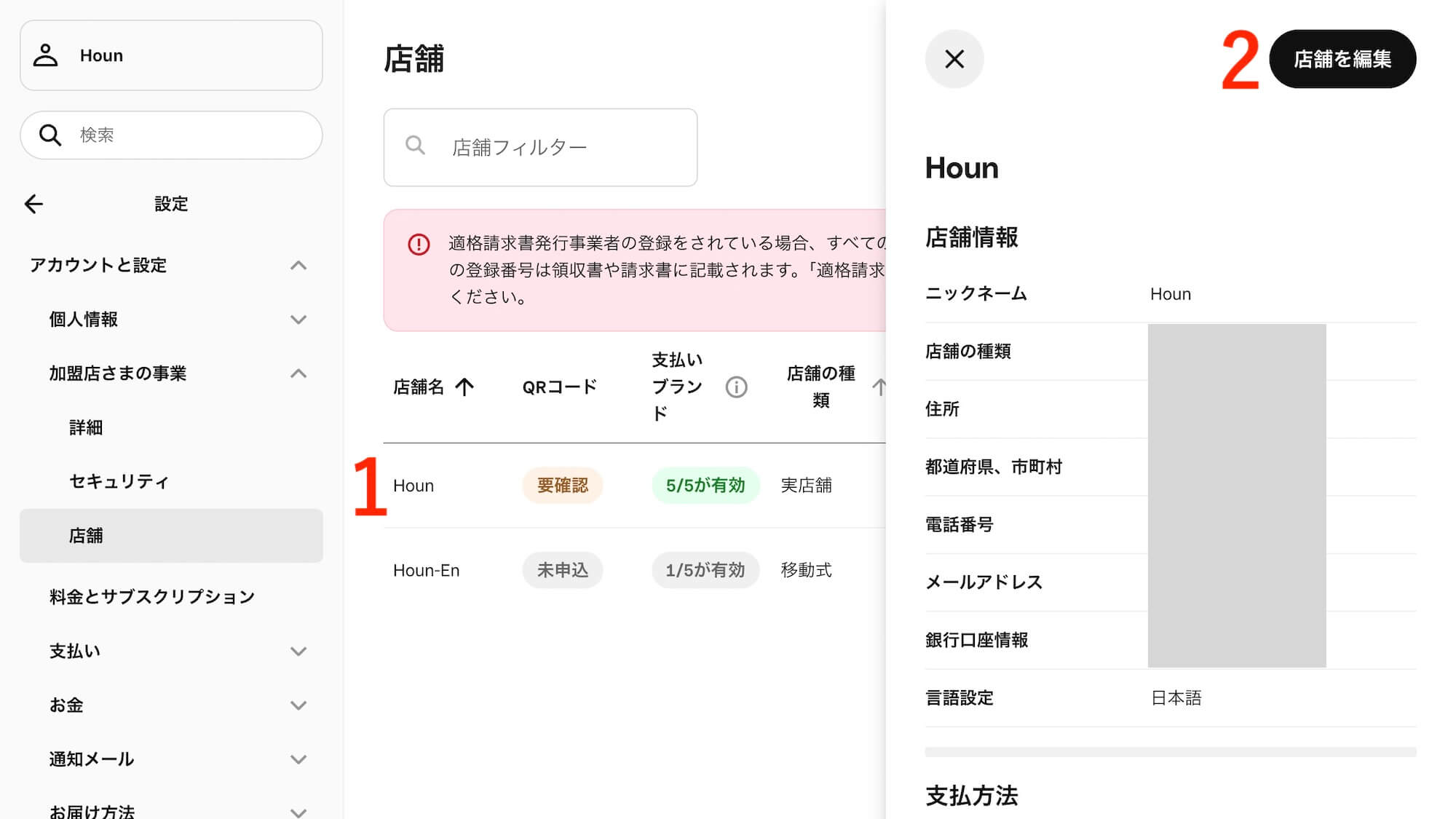 Squareデータ「店舗」ページを、少し時間を置いてから開くと、先ほどまで空欄だった追加店舗の「支払いブランド」に「1/5が有効」と記載されます(筆者の場合は15分ほどでした)。